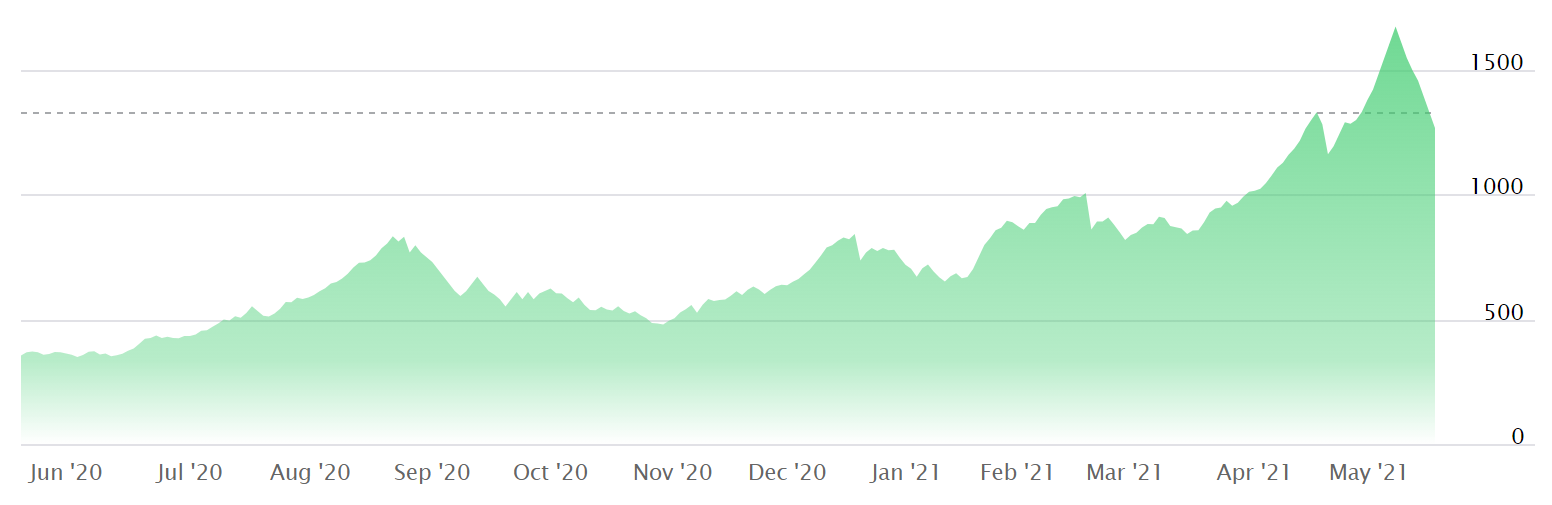 Koersverloop timmerhout (lumber) over het afgelopen jaar. (Bron: NASDAQ)