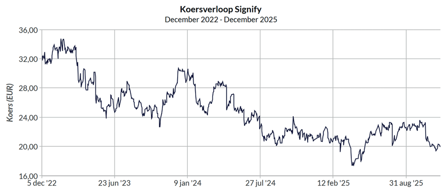 Het aandeel Signify valt eigenlijk al jaren tegen. Waar het halverwege 2021 nog boven de € 50 stond, is het inmiddels teruggevallen naar € 20. Het bedrijf bevindt zich in een uitdagende markt; de groei en marges staan onder druk. Inmiddels is de CEO vertrokken en is er een nieuwe aangesteld. Wel zien we een verschuiving. Signify lijkt van een lampenproducent steeds meer naar een technologiebedrijf te evolueren, met datagedreven en energie-efficiënte verlichting. In 2026 zal het bedrijf een Capital Markets Day houden, waarna we meer duidelijkheid krijgen over de strategische koers.