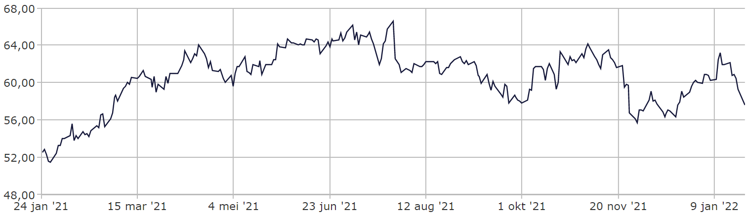 Na een onzeker jaar als gevolg van de uitbraak van de coronapandemie in 2020, werden geduldige aandeelhouders van Randstad dit jaar beloond met een keurig koersrendement van 13,42% over heel 2021 en een dividendrendement van 5,35%. Wel liep de aandelenkoers sinds juli vorig jaar langzaam terug en staat deze op het moment van schrijven circa 8% lager ten opzichte van het hoogste niveau van € 65,82 op 23 juli 2021. De teruglopende groeicijfers binnen de wereldwijde uitzendbranche lijken de belangrijkste oorzaak van deze koersdaling.