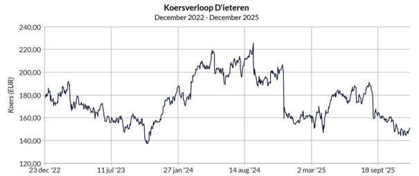 Koersverloop D’Ieteren de afgelopen drie jaar. Bron: Beursgenoten.