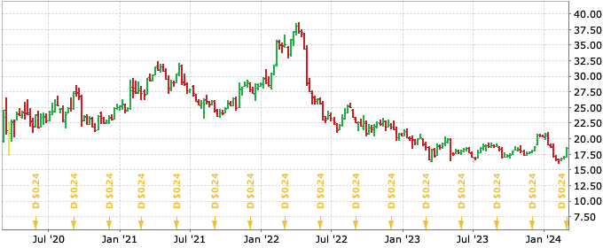 Koersverloop Virtu over de afgelopen vier jaar (dividenduitkeringen in geel).