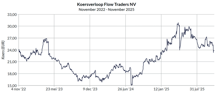 Koersverloop Flow Traders over de afgelopen drie jaar. Bron: Beursgenoten.