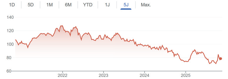 Koersverloop Nestle de afgelopen vijf jaar. Bron: Google.