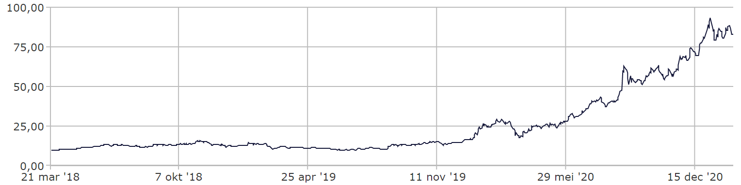Alfen werd in maart 2018 tegen een prijs van €10 naar de beurs gebracht. De eerste anderhalf jaar deed de koers niet veel, maar sinds augustus 2019 is de vlam in de pan en noteert het aandeel inmiddels €88. Alfen bestaat al sinds1937 waarbij het zich veelal bezig hield met schakelapparatuur voor elektriciteitsnetwerken. ‘Smart grids’, oftewel slimme transformatorstations en elektriciteitsnetwerken voor netwerkbeheerders en grote industriële klanten als glastuinbouw en zonneparken, zijn nog altijd goed voor 65% van de omzet. Sedert 2008 maakt Alfen laadpalen voor elektrische voertuigen (23% van de omzet) en is het actief met modulaire energie-opslagsystemen via batterijen (12% van de omzet).