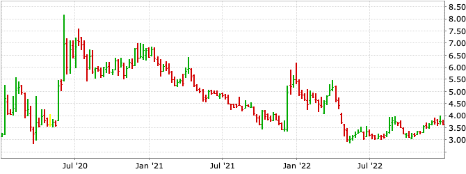 Grafiek 2: koersverloop Metabolic Explorer over de afgelopen drie jaar.
