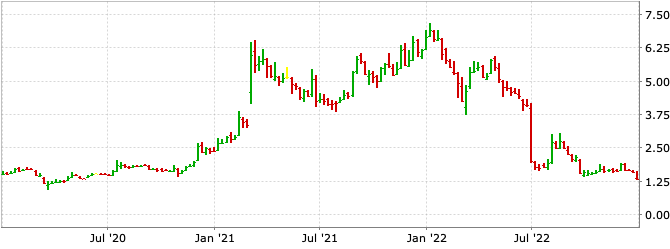 Grafiek 1: koersverloop Avantium over de afgelopen drie jaar.