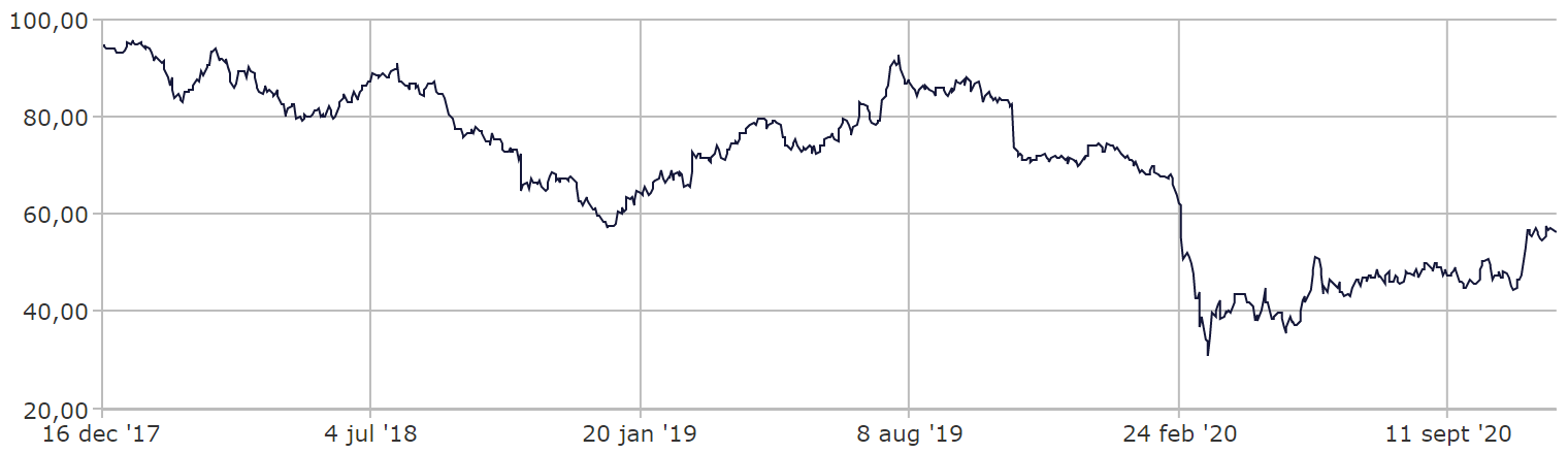 Koersverloop AB InBev over de afgelopen drie jaren.