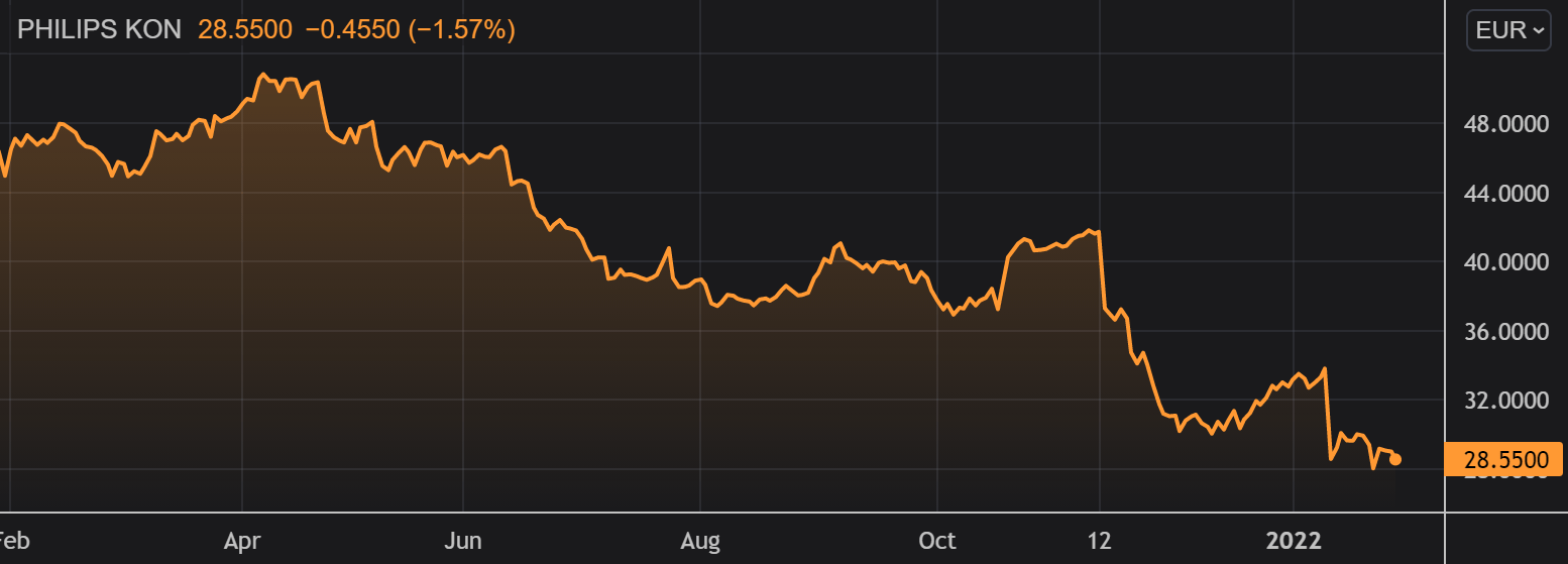 Voor Koninklijke Philips was 2021 zonder meer een rampjaar. De onderneming kreeg te maken met een terugroepactie van apparaten tegen slaap-apneu die inmiddels al honderden miljoenen euro’s gekost heeft, waar nog een onbekend bedrag aan schadevergoedingen bij komt. Bovendien werd het bedrijf, zoals veel andere ondernemingen, geconfronteerd met verstoringen in de leveringsketen en tekorten aan onder meer chips, waardoor de productie stagneerde. Verder werd de installatie van veel nieuwe apparatuur in ziekenhuizen uitgesteld als gevolg van corona. Het is dan ook geen wonder dat de koers bijna halveerde nadat in april vorig jaar nog een koerstop van ruim €50 was neergezet.