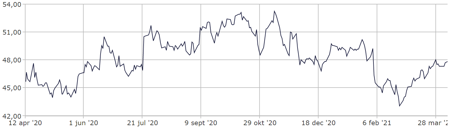 Koersverloop Unilever over de afgelopen 12 maanden.
