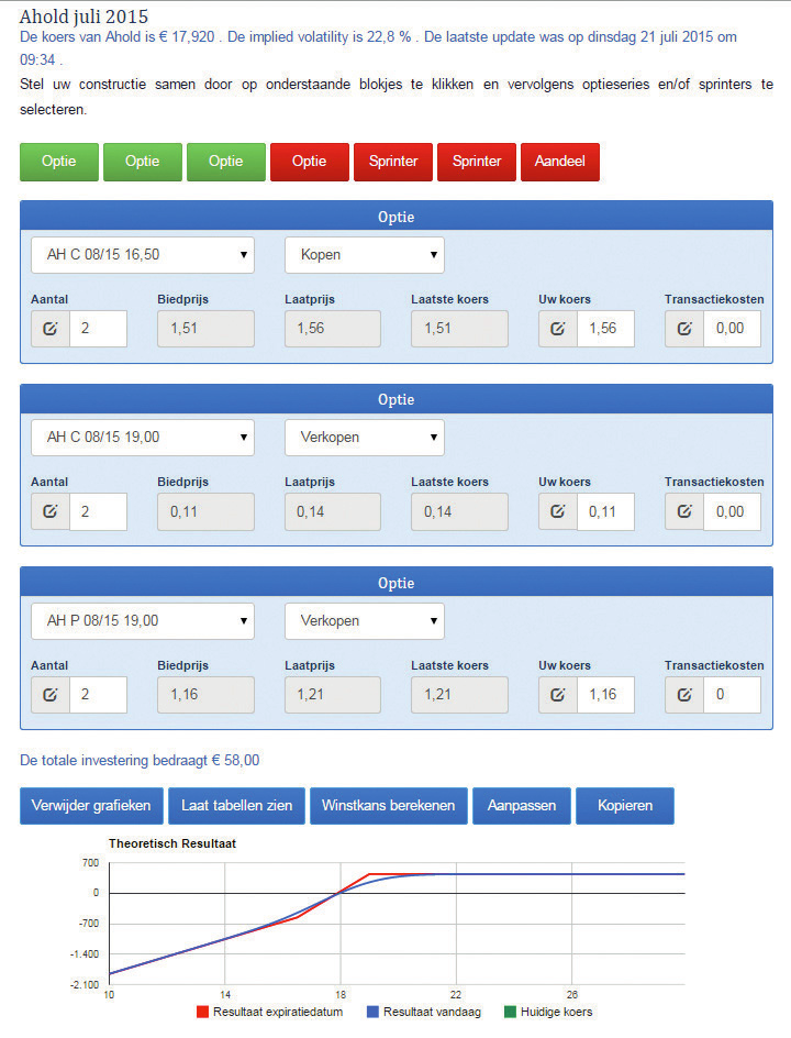 - Wijzigen. Deze functie brengt u naar een soortgelijke pagina als de Calculator. U kunt hier alle parameters aanpassen. Het eindresultaat kunt u vervolgens bewaren of kopiëren naar een nieuw item. Deze functie is handig als u bijvoorbeeld een onderliggende optiepositie wilt doorrollen of sluiten. U opent het huidige item met de functie aanpassen. Nadat u de posities heeft aangepast kopieert u het item naar een nieuw item. Vervolgens sluit u het oude item zodat dit resultaat bewaard blijft.