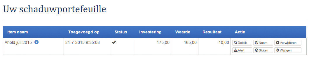 Op portefeuille pagina ziet u uw eigen schaduwportefeuille en die van Beursgenoten. U hebt de schaduwportefeuille gemaakt door in de Calculator de optie ‘Bewaren’ te gebruiken. Per item ziet u de volgende informatie: