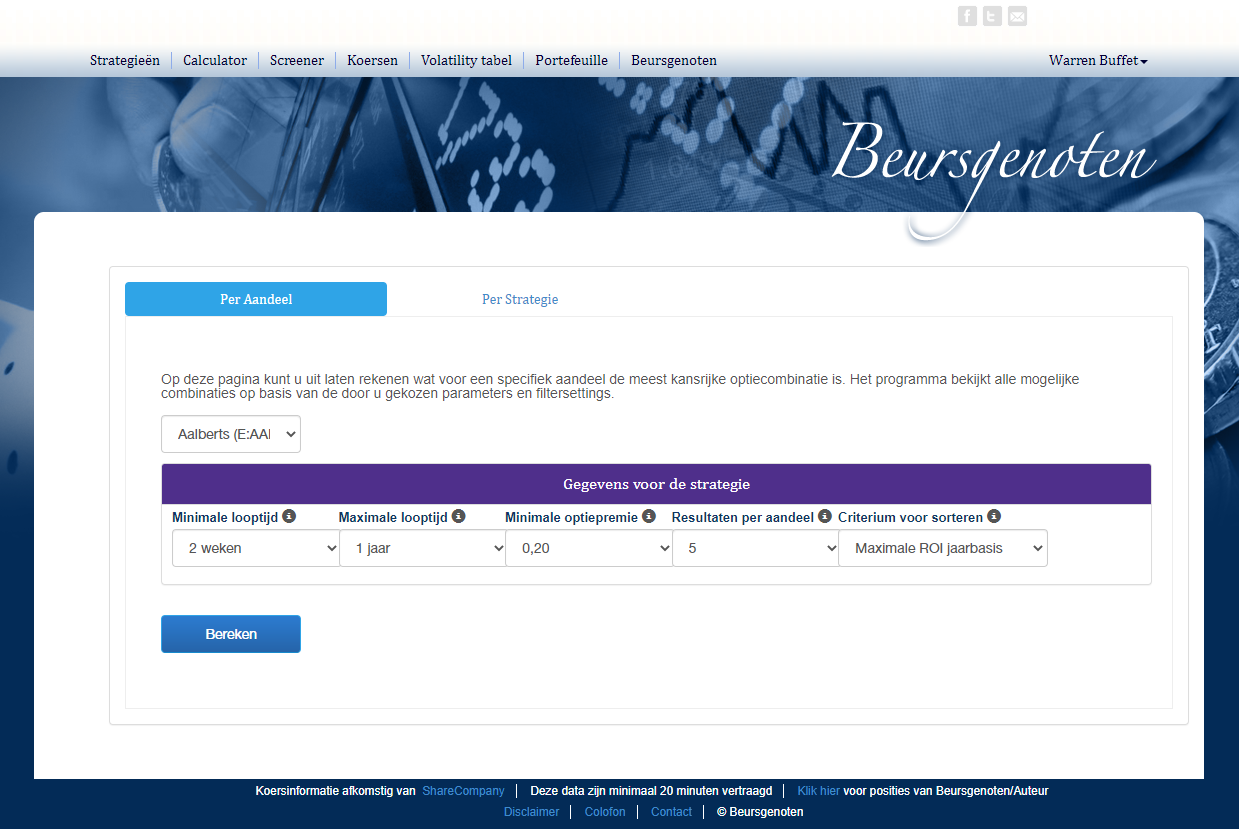Hier kunt u een aandeel kiezen en vervolgens wordt een aantal constructies doorgerekend. Voor elke constructie worden de vijf beste resultaten getoond.