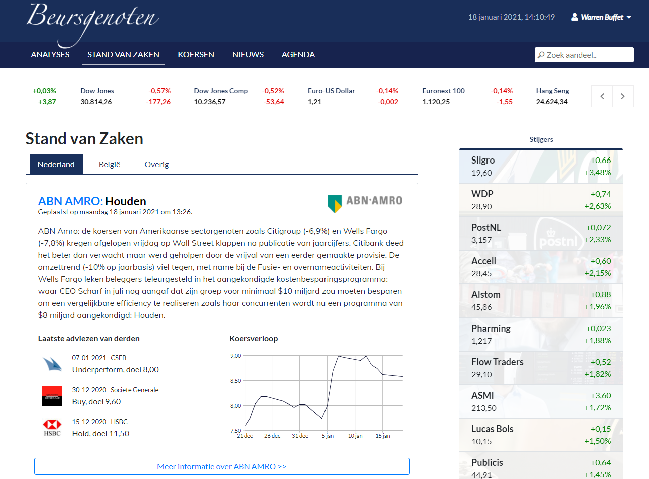 Elke dag voor dag en dauw evalueren de analisten van Beursgenoten de bedrijven en zetten hun bevindingen met het daarbij behorende hernieuwde beleggings-advies bij ‘Stand van Zaken’. Beleggen is voortschrijdend inzicht. Elke dag veel cijfers. U ziet in een oogopslag of u een bepaald aandeel beter kunt verkopen, kopen of houden. Wij adviseren u deze pagina dagelijks in de gaten te houden.